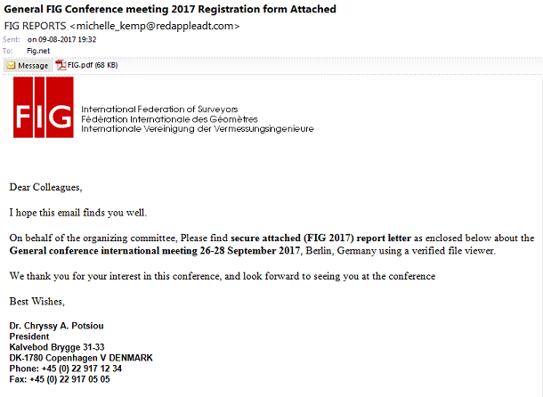 Please note that a mail sent out around 9 August about General conference international meeting 26-28 September 2017 is fraud. This meeting is not taking place. The email is sent from FIG REPORTS michelle_kemp[at]redappleadt.com.